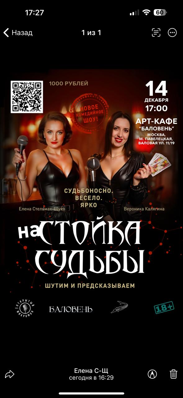 «НаСтойка судьбы» – это интерактивное шоу, где харизматичная комикесса Елена Стельмах-Щуко шутит, а обворожительная тарологиня Вероника Калягина гадает на картах таро, а вместе они создают незабываемый вечер для гостей.