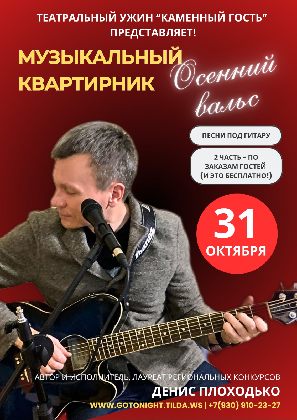 Вас ждёт атмосфера тёплого вечера с живой музыкой, душевными текстами и вкусными блюдами! Добавьте к этому любимый напиток или капучино. Это не просто концерт - это уютный квартирник, где царит магия, а каждый гость становится частью музыкального действа.
